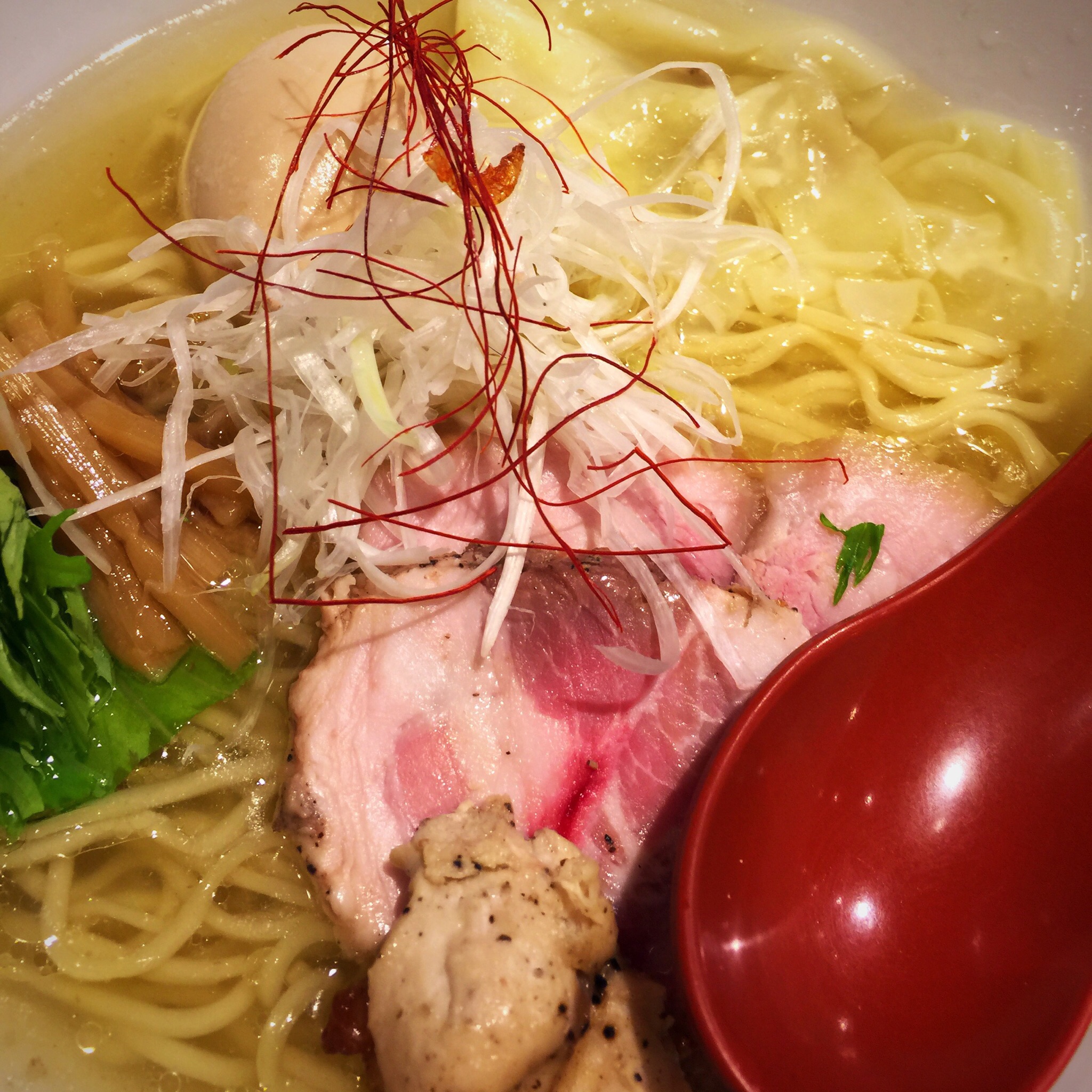 特製はゴージャスで、チャーシュー、玉子、水菜、ワンタン、鶏モモ、白髪ネギなど具だくさん。
