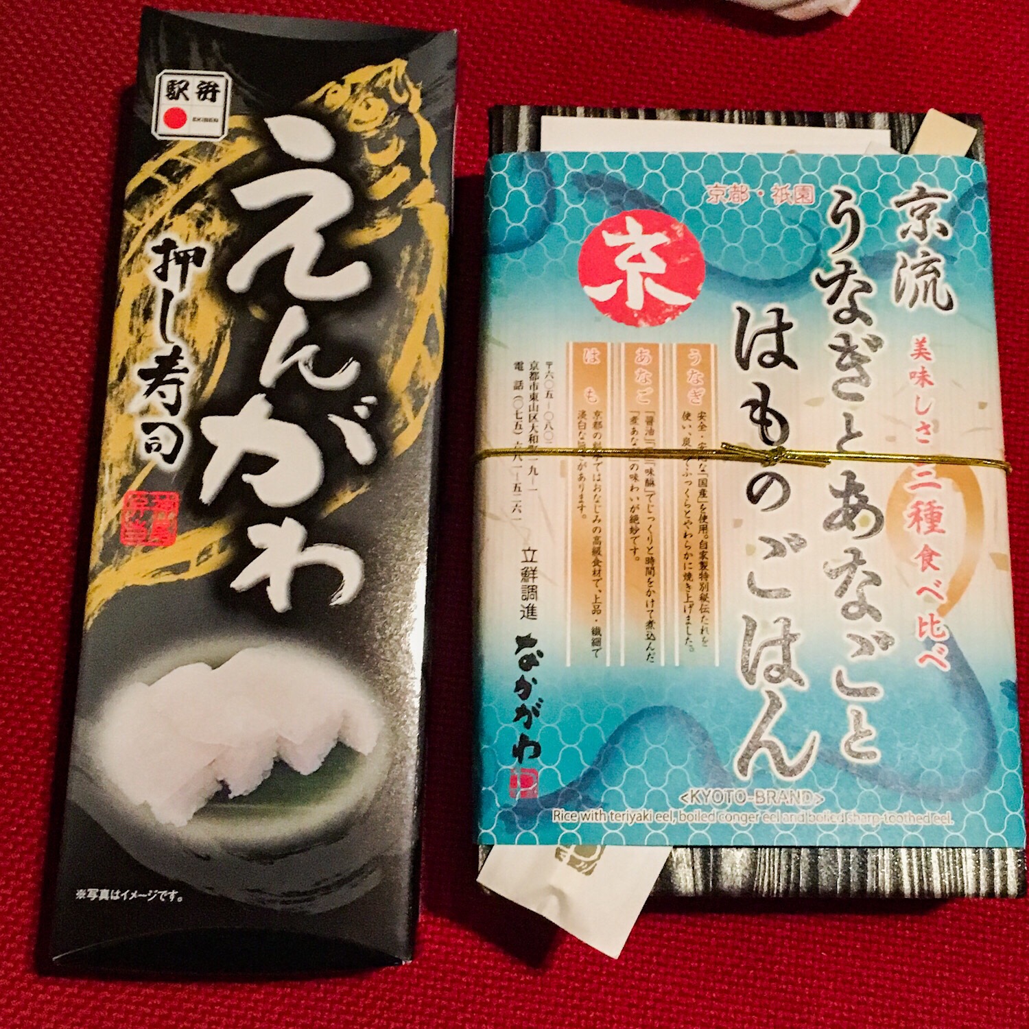 京王の駅弁大会で「えんがわ押し寿司」と「京流うなぎとあなごとはものごはん」と「赤福」をいただく
