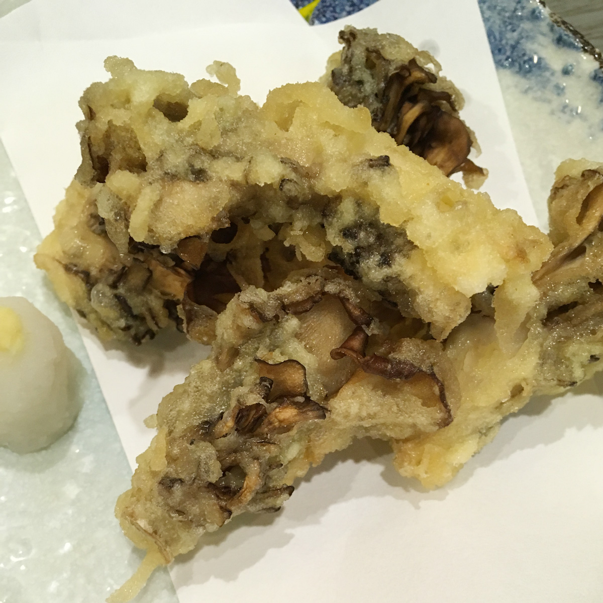 パリパリに揚がった舞茸の天ぷら。サクサクして酒がすすむー。
