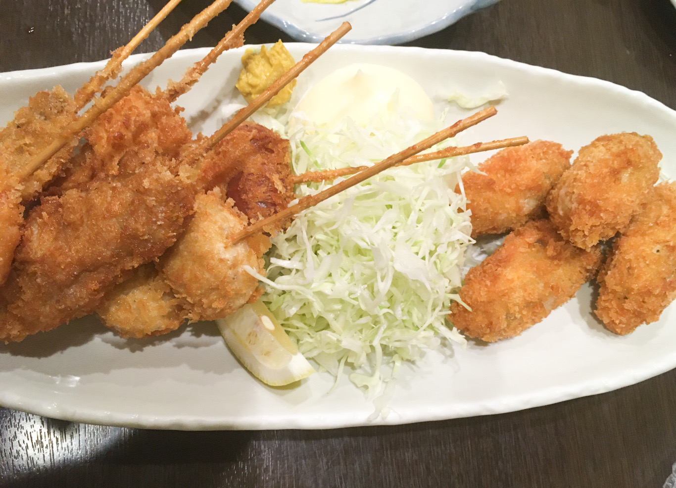 串揚げの盛り合わせとカキフライ。盛り合わせは肉と魚の組み合わせ。ホタテなど旬の食材でどれも美味しい。カキフライは熱々で新鮮な牡蠣のフライ!