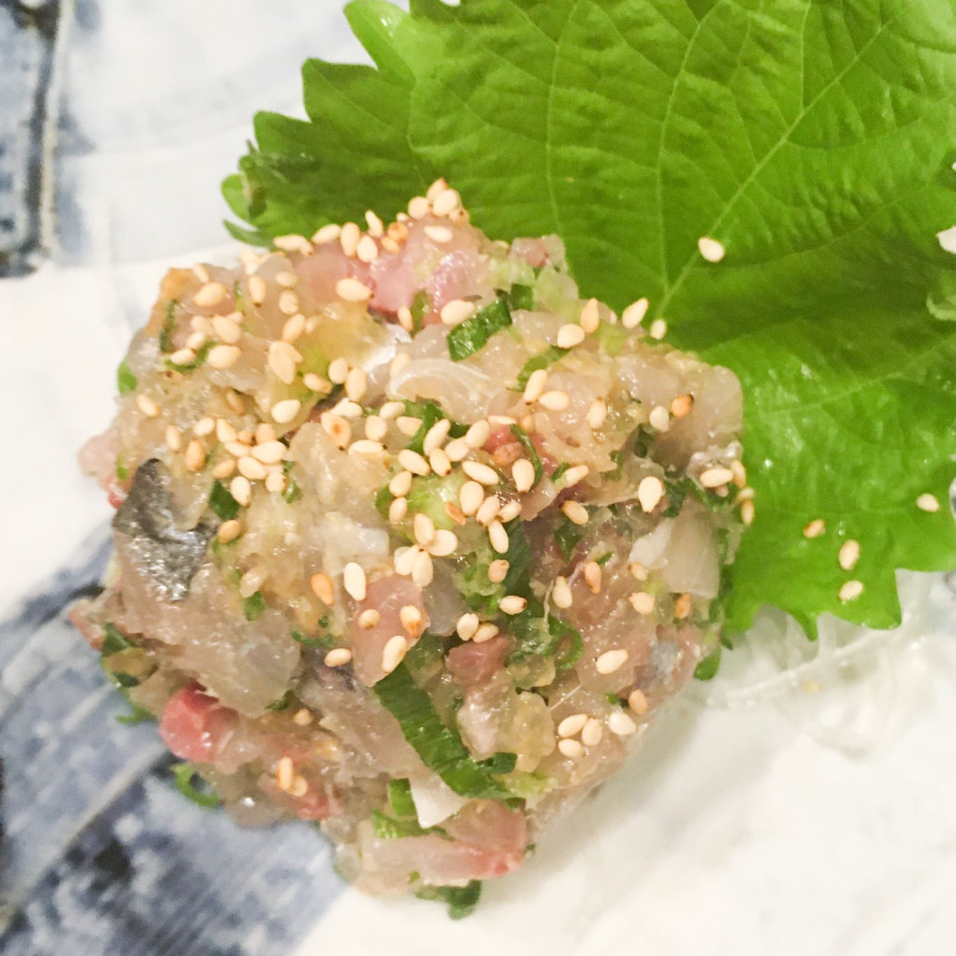 鯵のなめろう。酒のつまみとしては最適だよねー。鯵の風味と生姜のピリッとした味わいで酒がすすむ。